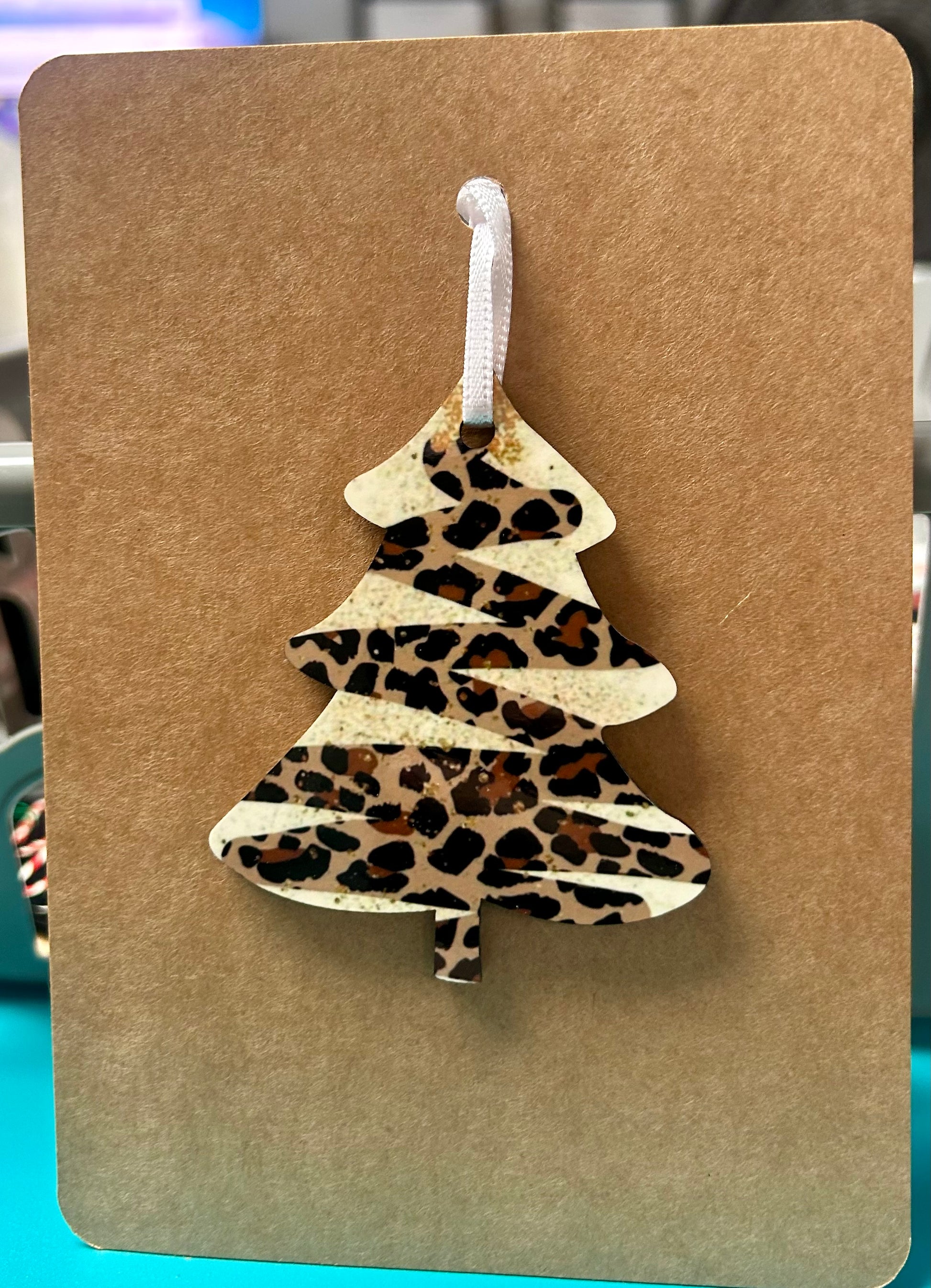3"X2" tree shaped ornament. Comes with an adjustable ribbon to hang at your desired length.