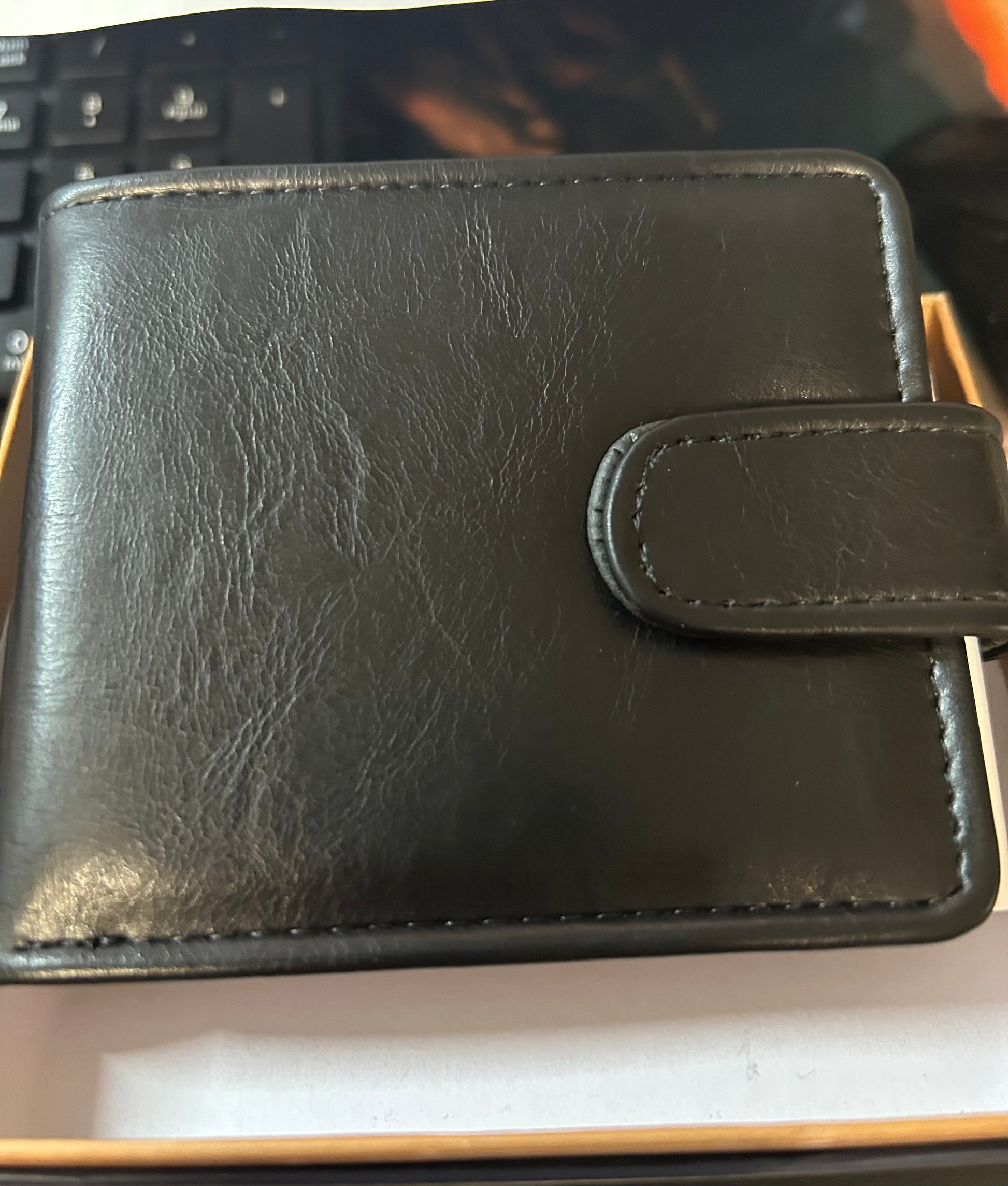 Vegan leather with snap closure.