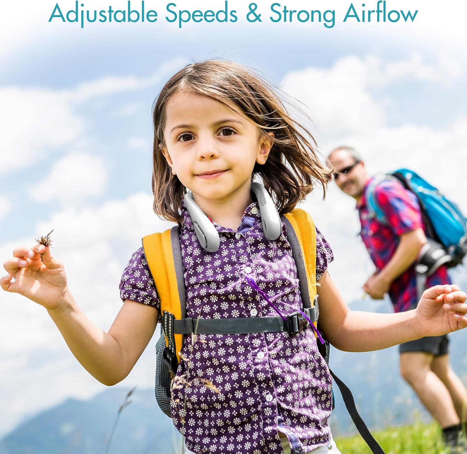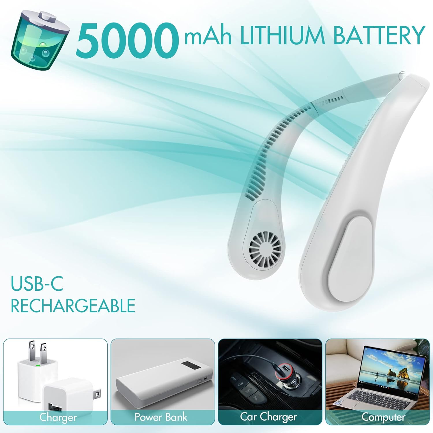 Hand-free Design & Angle Adjustable: Its hand-free design is to release your hands. Also, with the soft silicone on the neck part of the fan, you can always adjust the angle of the airflow at will. And the many little air outlets spreading over the fan can give you 360-degree silent wind around your neck and face